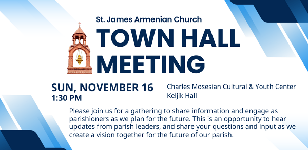 Parishioners are invited to an open Town Hall meeting on Sunday, November 16th at 1:30pm in the Charles Mosesian Cultural & Youth Center’s Keljik Hall. Join us to hear about recent updates, and share feedback as we vision and plan for the future of our parish together. Your insight and questions are essential as we look ahead to the 100th Continue Reading