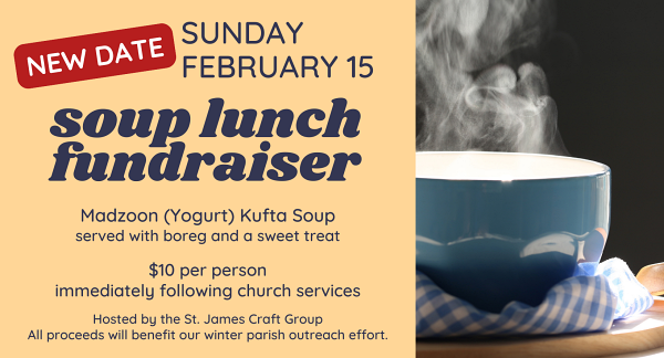 Warm up on a winter day with Madzoon (yogurt) Kufta Soup, boreg, and a sweet treat for $10 per person. Hosted by the St. James Craft Group - all proceeds will help offset expenses for their parish winter outreach effort. Immediately following Church services, prior to the Town Hall Meeting. All are welcome.