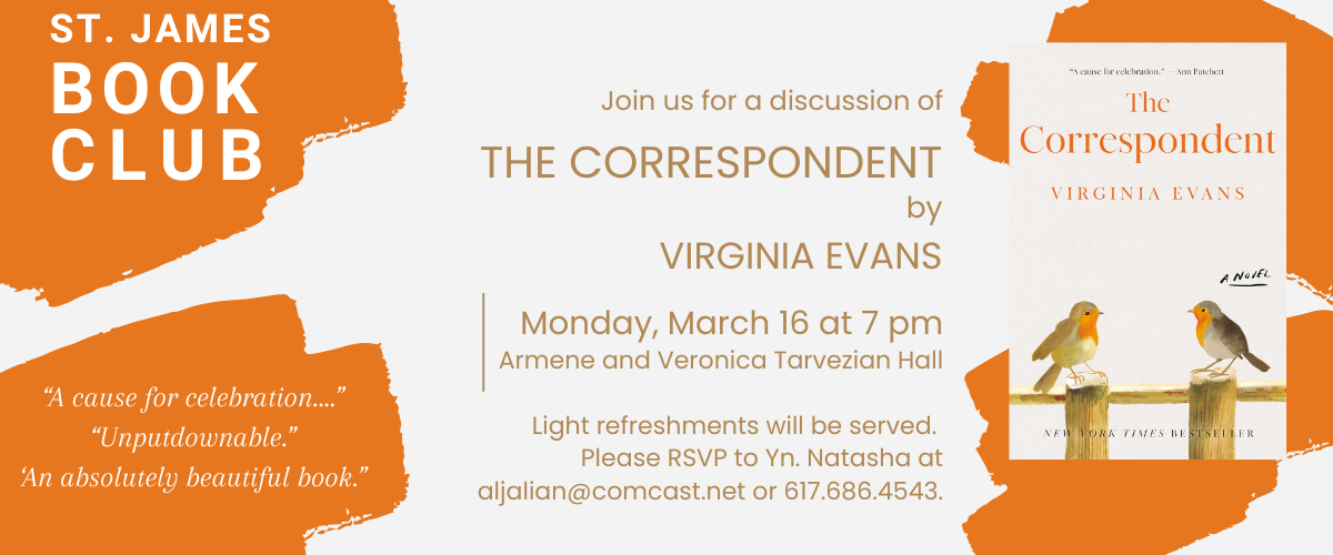Monday, March 16 - St. James Book Club. We are pleased to announce our next gathering! We will discuss The Correspondent by Virginia Evans.
