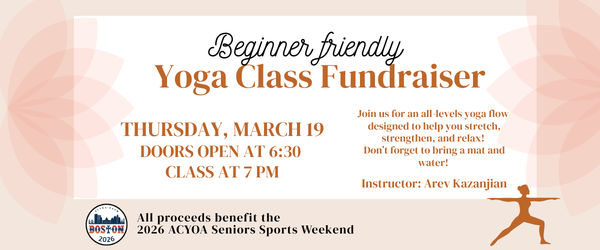 Thursday, March 19 - All are welcome! Join us for an all-levels yoga flow class designed to help you stretch, strengthen and relax! Class Instructor: Arev Kazanjian. Organized by the St. James ACYOA Seniors to benefit this year's 2026 ACYOA Senior General Assembly & Sports Weekend. $25 per person. View flyer. Please RSVP here.